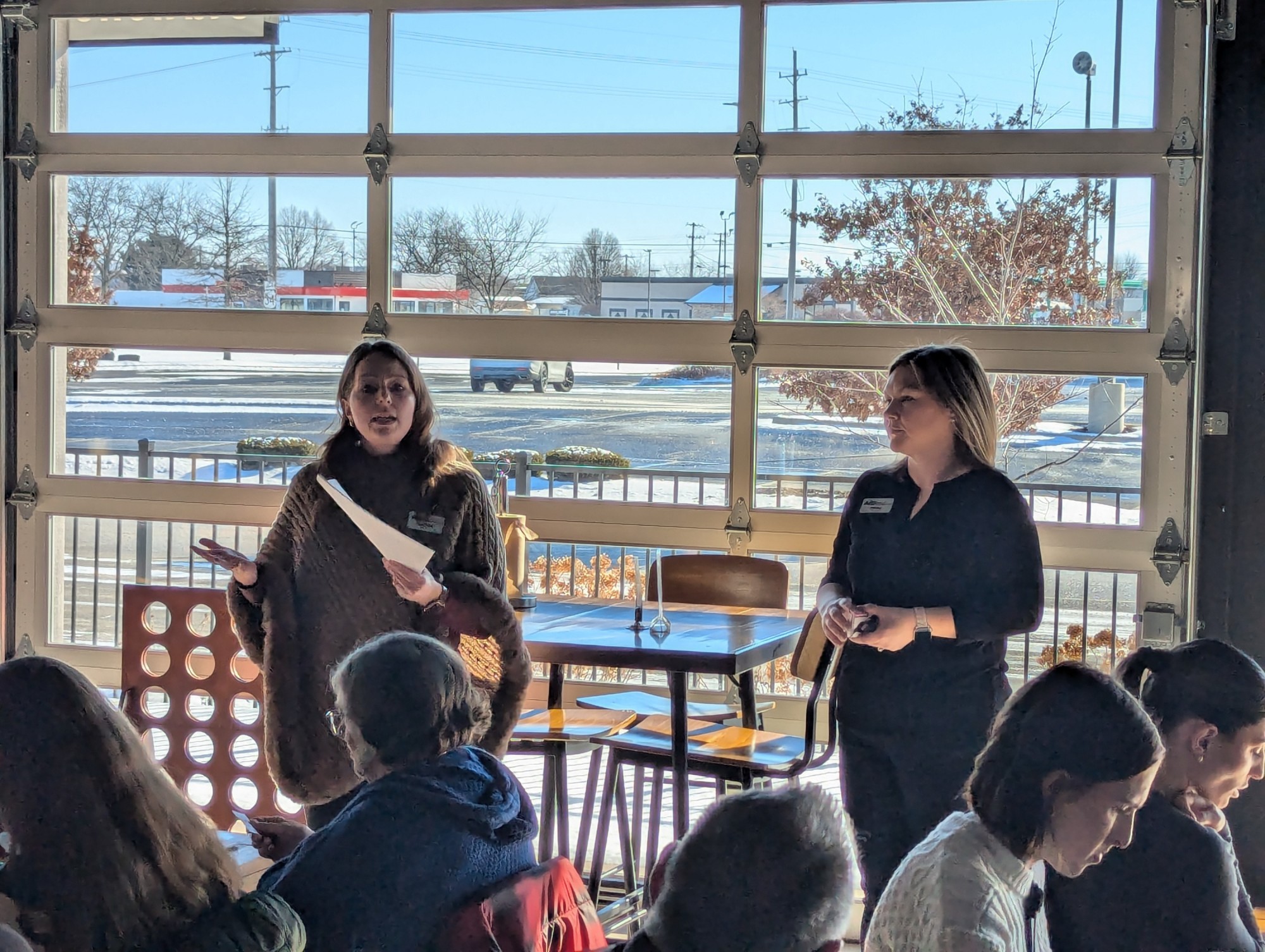 Alyssa Marrero and Ashley Heinekamp of Association for Individual Development spoke about supporting mental health crises through community-based mobile crisis response on Tuesday, January 14th at Station One Smokehouse in Yorkville. Alyssa and Ashley provided guidance on identifying mental health crisis and how to respond. AID provides a 24-hour crisis line and mobile crisis support to members of the community, which can be used as an avenue to other resources and referrals as needed. They also shared information about the 988 Suicide & Crisis Lifeline, which provides 24/7 mental health crisis support.