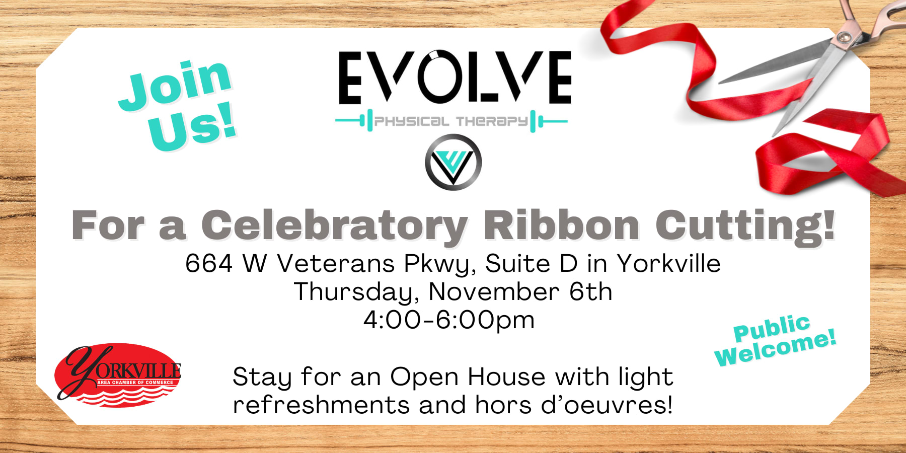 Join us for a Ribbon Cutting to welcome Evolve Physical Therapy & Sports Medicine to their Yorkville location! Open house to follow with light refreshments and hors d'oeuvres.