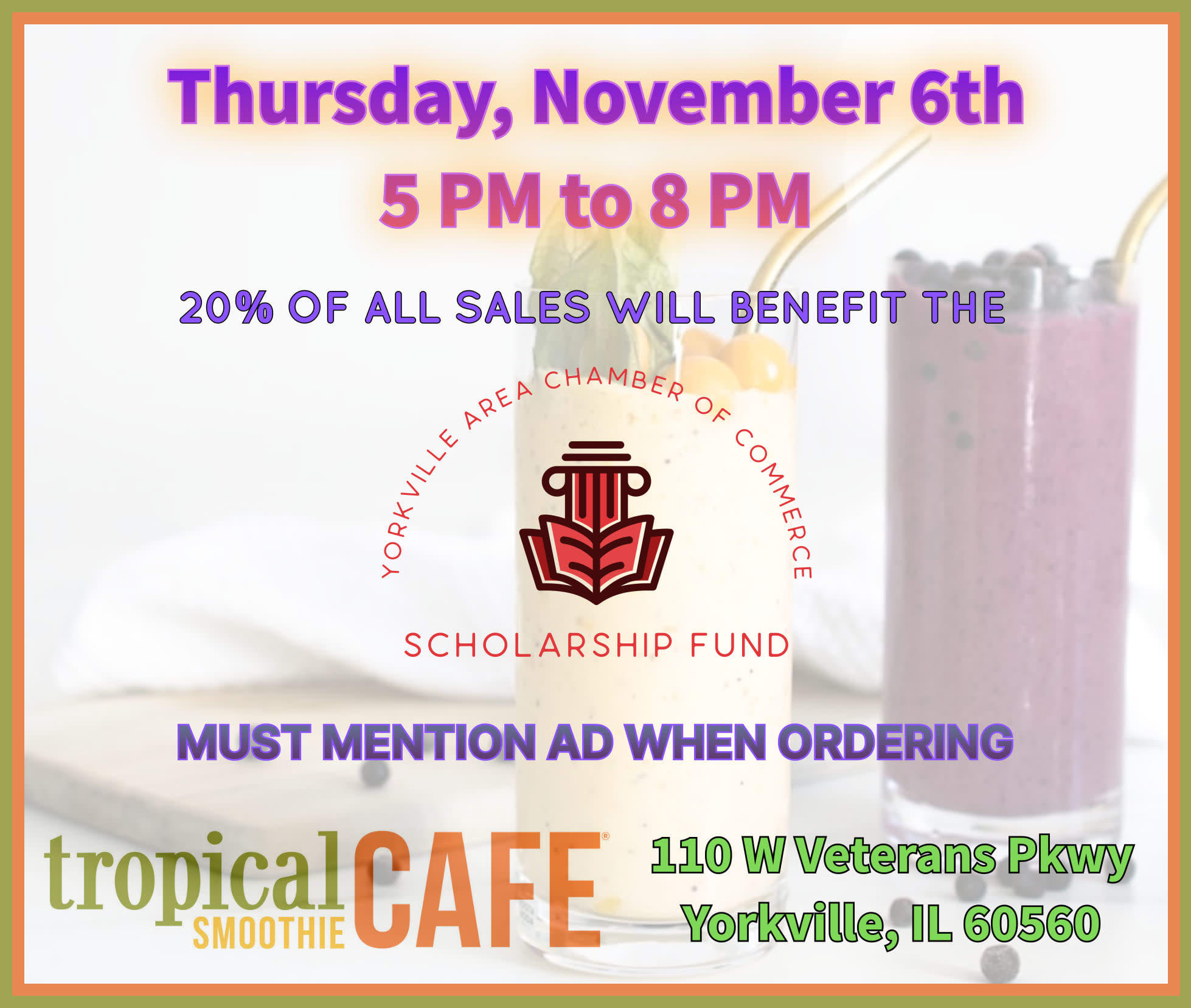 Tropical Smoothie Cafe, located next to Walgreens in Yorkville, will generously donate 20% of all food and beverage sales on Thursday, November 6th from 5-8 PM.