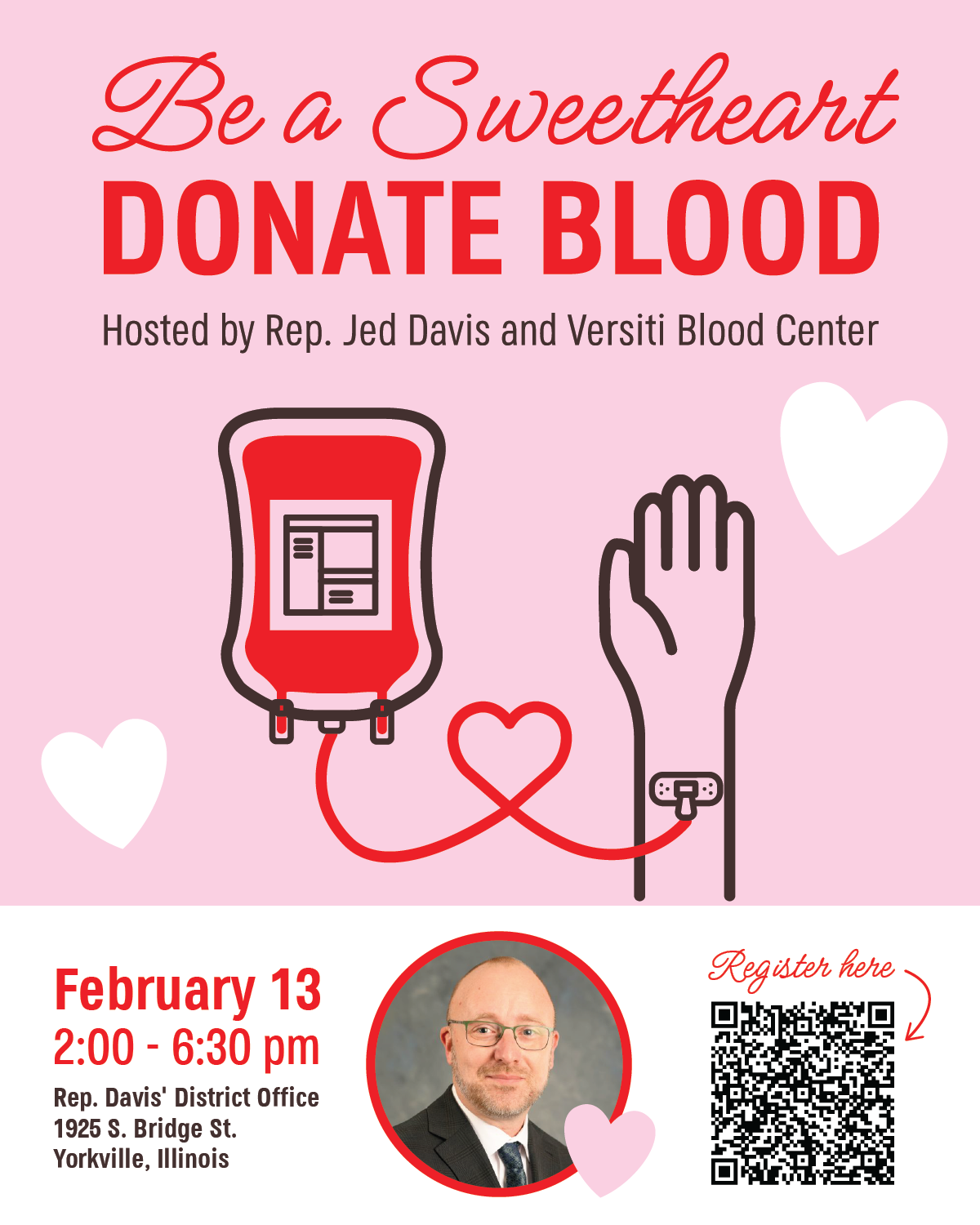 My office is hosting a blood drive on February 13th from 2:00 p.m. to 6:00 p.m. at my district office in Yorkville. This is a great way to give back to your community and save lives!