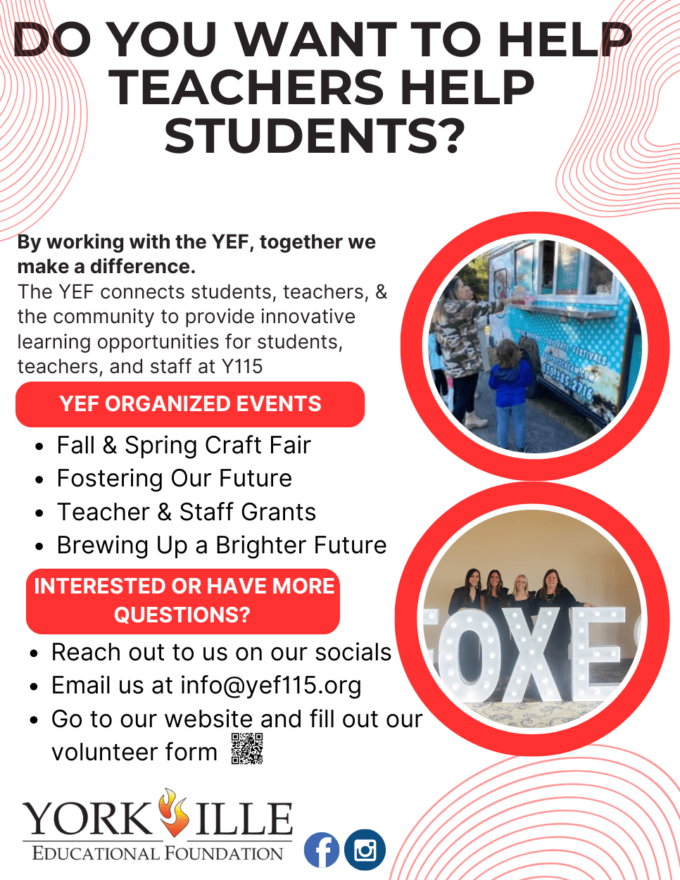 Together we make a difference. Yorkville Educational Foundation, the non-profit fundraising arm of Yorkville CUSD 115, connects students, teachers, and the community to provide innovative, real-world learning opportunities and ensure teachers have an opportunity to implement programs that provide engaging, meaningful classroom experiences. The Foundation creates relationships with local businesses, organizations, and community members to fund opportunities outside of the district tax-supported budget.