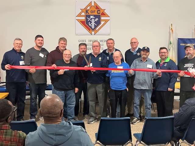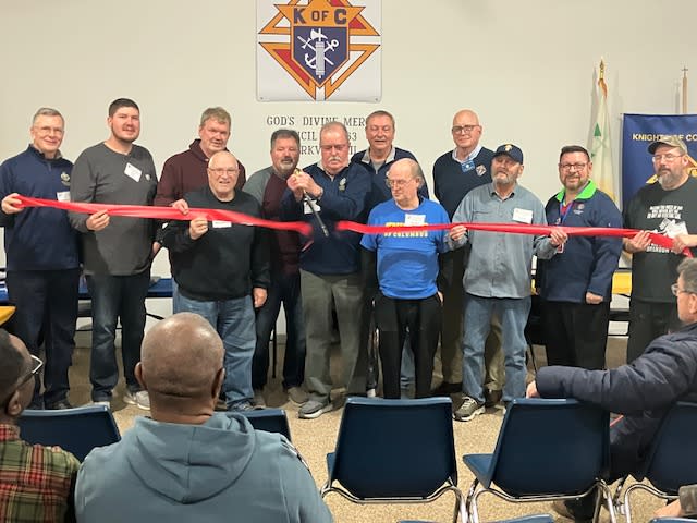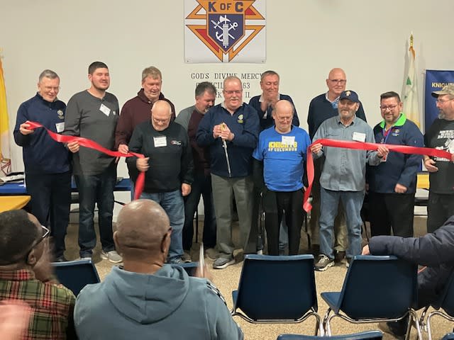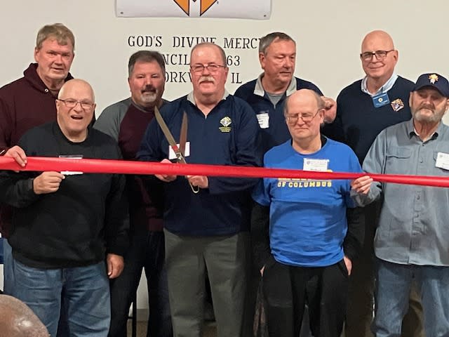Yorkville Knights of Columbus God’s Divine Mercy Council #14463 performed a ribbon cutting at their Social Meeting on Wednesday, January 8, 2025. We are celebrating our new meeting chambers at 205 W. Beaver St. in Yorkville. Pictured are Grand Knight Jim Zbella (with scissors), and his officers. Special thanks to Loren Underhill, owner of the property, for letting us use the space for our new chambers.